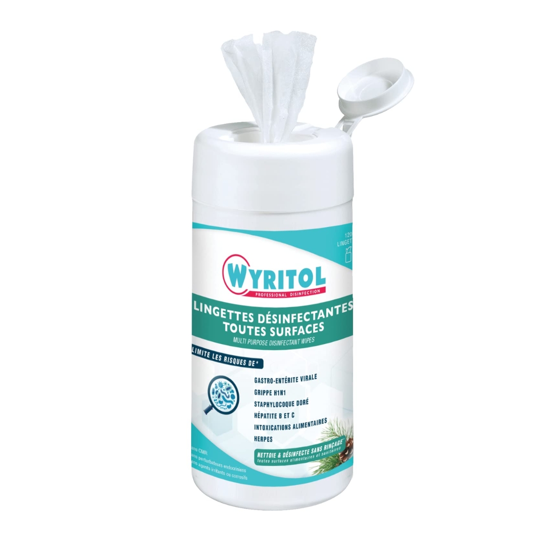 WYRITOL LINGETTES DESINFECTANTES, nettoient et désinfectent sans rinçage. Bactéricide, virucide, lévuricide. Parfum mentholé.