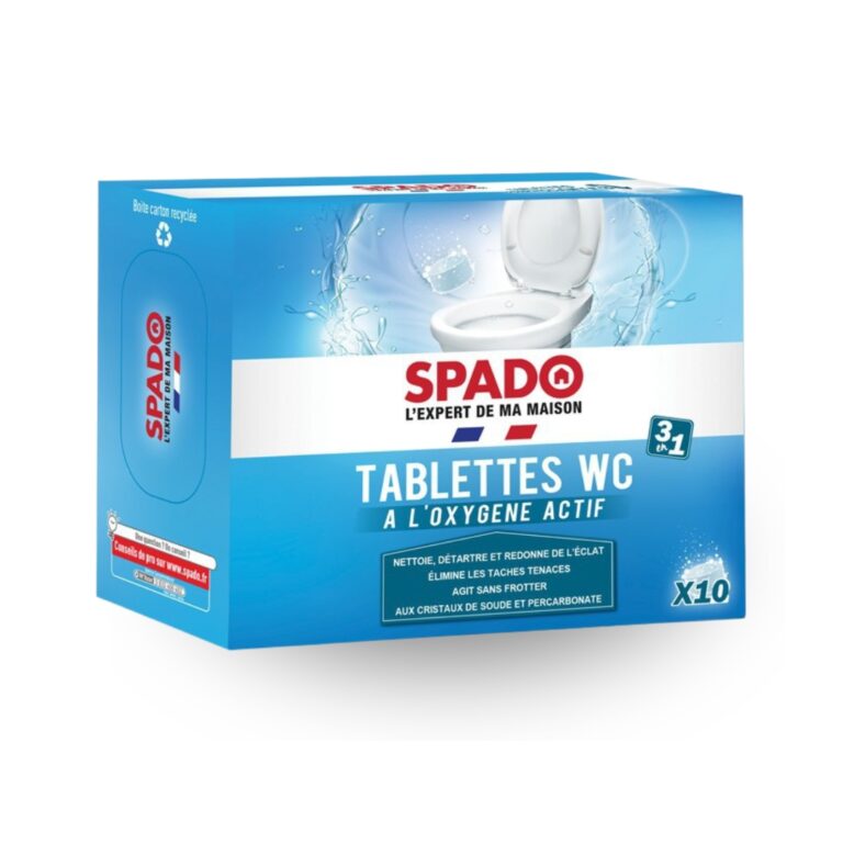 SPADO TABLETTES WC X10, tablettes nettoyantes 3 en 1, nettoie, détartre et redonne éclat. Formule naturelle, sans danger pour fosses septiques.