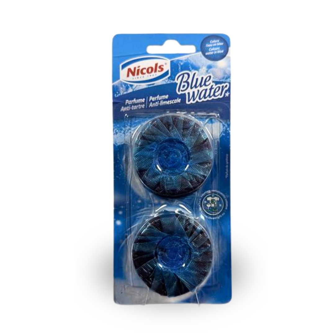 BLOC WC eau bleue, nettoie, désodorise, lutte contre le tartre, colore l’eau en bleu et laisse un parfum frais.