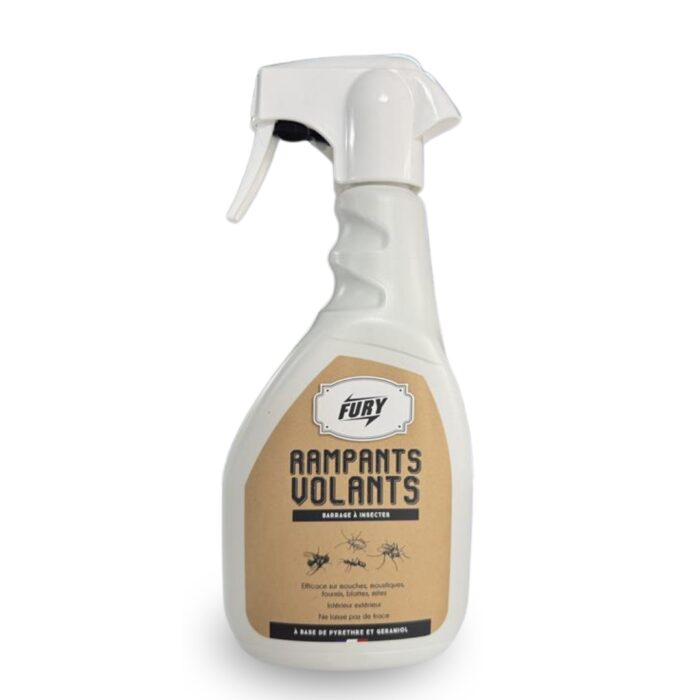 FURY SPRAY RAMPANT & VOLANT est un répulsif insecticide à base de pyrèthre végétal et de géraniol, conçu pour lutter efficacement contre les insectes rampants et volants tels que mouches, moustiques, fourmis, blattes, mites alimentaires et vestimentaires. Il peut être utilisé en intérieur comme en extérieur, sans laisser de traces sur les surfaces.