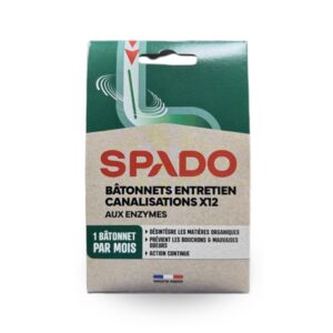 SPADO BATONNETS ENTRETIEN CANALISATION sont conçus pour entretenir les canalisations et désodoriser durablement. Leur formule naturelle à base d’enzymes et de spores de bactéries agit en continu dès le contact avec l’eau, dégradant efficacement les matières organiques. Sans soude ni acide, ils sont sans danger et compatibles avec les fosses septiques.