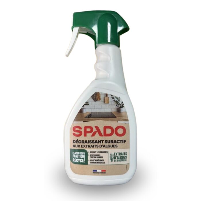 SPADO DEGRAISSANT ECOLOGIQUE est un nettoyant puissant à base d’algues brunes biosourcées, récoltées en Bretagne. Il nettoie en profondeur et dissout les graisses, même cuites et incrustées, tout en neutralisant les mauvaises odeurs. Sa formule gel permet une application sans coulure et une excellente adhérence aux surfaces. Il laisse un parfum frais de bambou et est apte au contact alimentaire.