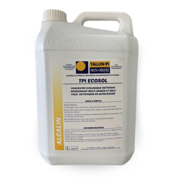 TPI ECOSOL est un concentré écologique nettoyant dégraissant multi-usages, spécialement conçu pour le nettoyage des sols en autolaveuse ou en application manuelle. Sa formule à base d’extraits végétaux et d’agents surfactifs biodégradables est sans phosphates, sans solvants, sans COV, et respecte les normes environnementales en vigueur.